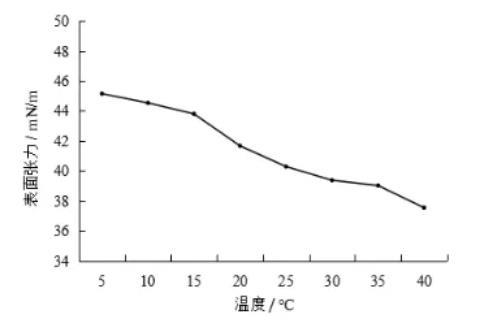 由圖1可以看出合成血液表面張力隨著溫度的升高而減少,從原來(lái)的45.149mN/m降至37.540mN/m。因?yàn)殡S著溫度升高,分子鍵引力減弱,表面張力隨溫度升高而減少。同時(shí),溫度升高,液體的飽和蒸氣壓增大,氣相中的分子密度增加,氣相分子對(duì)液體表面分子的引力增大,導(dǎo)致液體表面張力減少。