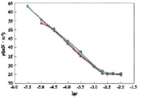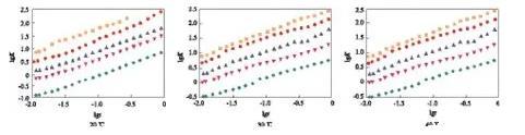 在lgc=-3.00時(shí),可看出較完整的動(dòng)態(tài)表面張力降低曲線(xiàn),開(kāi)始時(shí)表面張力接近溶劑的表面張力,隨時(shí)間的延長(zhǎng)表面張力先快速下降,降至一定數(shù)值后,降幅趨緩,在一段時(shí)間內(nèi)基本保持不變。因?yàn)闅?液界面新生成時(shí),GSS362尚未在表面吸附,界面張力為溶劑的表面張力,隨著時(shí)間的延長(zhǎng),表面活性劑分子開(kāi)始在表面吸附,氣/液界面張力降低,隨著吸附的進(jìn)行,表面逐步趨于飽和,表面活性劑分子在表面吸附的速率下降,因而動(dòng)態(tài)表面張力下降速率變慢,趨于平衡。