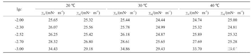 采用JK99C型表面張力儀由低濃度至高濃度測(cè)定恒溫后系列溶液的表面張力(γ),做γ-lgc(c為濃度)曲線(xiàn)。測(cè)試均在帶有恒溫夾套的玻璃杯中進(jìn)行,外接數(shù)控超級(jí)恒溫槽,溫度控制在預(yù)設(shè)溫度,溫度選擇為20,30,40℃。