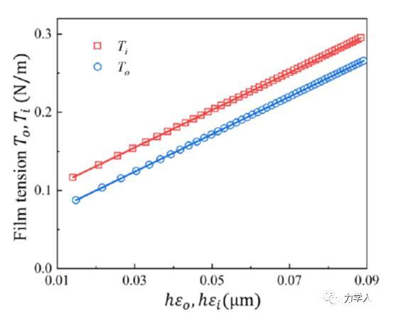 基于該平衡構(gòu)型的解析解,本研究發(fā)現(xiàn)薄膜在接觸線附近的彈性應(yīng)變可以由薄膜的鼓包角解析給出。由此,本文給出了在一般條件下,薄膜在接觸線附近的彈性應(yīng)變隨鼓包角的解析關(guān)系。圖3表明,基于該解析關(guān)系給出的薄膜彈性應(yīng)變可以很好的描述薄膜總張力隨薄膜厚度及接觸線附近應(yīng)變的演化規(guī)律?;诖?,本文提出了采用線性外推薄膜總張力隨薄膜厚度和接觸線附近薄膜應(yīng)變乘積的方法來確定固體表面張力的方案。