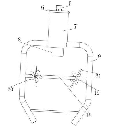 步驟三:在兩根出液管帶動(dòng)加強(qiáng)桿轉(zhuǎn)動(dòng)的同時(shí)將帶動(dòng)渦輪葉片轉(zhuǎn)動(dòng),使轉(zhuǎn)動(dòng)的渦輪葉片能夠通過(guò)轉(zhuǎn)軸帶動(dòng)攪拌桿轉(zhuǎn)動(dòng),使攪拌桿對(duì)混料桶內(nèi)的試劑溶液進(jìn)行橫向攪拌混合,提高混合效果。