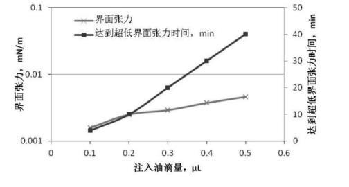 采用本實(shí)驗(yàn)步驟1中(1)和(2)的方法配置0.12%P+0.2%S的溶液體系,將0.12%P+0.2%S的溶液體系分別充滿5個(gè)樣品測(cè)量管中,微量注射器分別吸取高凝油油滴量為0.1μL、0.2μL、0.3μL、0.4μL、0.5μL注入前述的5個(gè)樣品測(cè)量管中,高凝油呈圓柱狀;采用本實(shí)例步驟1中(3)的方法測(cè)量無(wú)堿二元驅(qū)配方體系與高凝油間界面性。