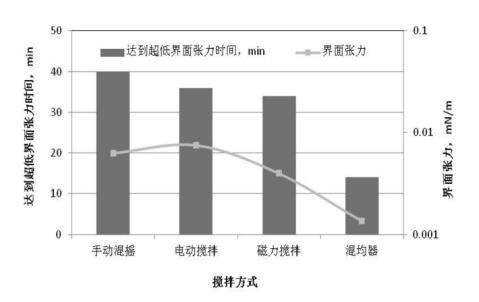 mN/m;手動(dòng)混搖的方式達(dá)到超低界面張力的時(shí)間最長(zhǎng),為40分鐘,電動(dòng)攪拌和磁力攪拌差別不大?;靹蚱鲾嚢璺绞绞谷芤耗茉诙虝r(shí)間內(nèi)達(dá)到均相且均相程度高,均相程度越高,達(dá)到超低界面張力的時(shí)間越短。