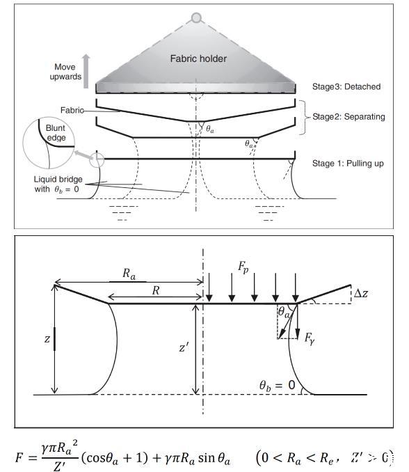 基于液體表面張力的理論模型從濕態(tài)貼附現(xiàn)象的成因出發(fā)進(jìn)行構(gòu)建,可預(yù)測(cè)分離過(guò)程第二階段(逐漸分離階段)中各種織物與液體之間的貼附力。