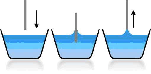 高精度的Du Noüy方法最早是由Padday等人所提出的(J Chem Soc Far Trans 71: 1919-1931, 1974)。這種技術非常簡單:將一根細桿(不是一個環(huán)或者一個板)浸沒到樣品中,然后拔出,對最大的力進行測定。探針的直徑是不相干的,只有直徑變化才需要重新校準。Kibron公司的所有儀器都是全自動的并且檢測快速。當利用一個已知表面張力的液體做完校正后就沒必要去修正。彎液面的重量僅僅依賴于表面張力、桿的直徑以及液體的密度(參見上述Padday et al的文章)。