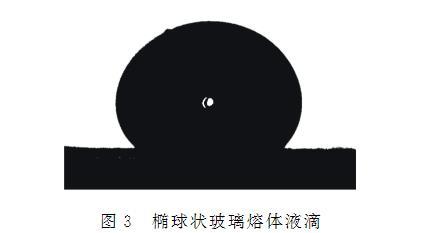 將制備的玻璃樣塊用錫紙包裹,用鐵錘捶碎后用鉗子修整成較方正的顆粒,選取內(nèi)部無氣泡結(jié)石且質(zhì)量為0.15~0.30g的碎塊用于測(cè)試。測(cè)試前選用T4溫度表面張力為334 mN/m的標(biāo)準(zhǔn)鈉鈣玻璃校準(zhǔn)表面張力測(cè)量儀。測(cè)試的具體操作步驟如下:將表面張力測(cè)量儀加熱爐升溫至測(cè)量溫度,通入高純氮?dú)庾鳛楸Wo(hù)氣體,然后將制備好的玻璃樣品置于石墨片上,送入加熱爐中的樣品臺(tái)上進(jìn)行保溫,試樣在表面張力作用下收縮成橢球狀液滴,如圖3所示,將液滴置于拍攝裝置視野中心,保溫30 min至熔體穩(wěn)定。隨后,用圖像采集裝置獲取橢球熔體的外輪廓線,通過軟件數(shù)值分析得到輪廓參數(shù),利用Young-Laplace方程進(jìn)行解析,計(jì)算出樣品的表面張力(σ),反復(fù)測(cè)試若干次后取σ的平均值為樣品在該測(cè)試條件下的表面張力值。