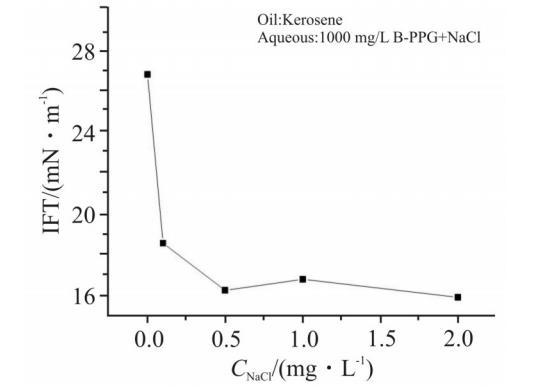 礦化度是影響化學(xué)驅(qū)配方效果的關(guān)鍵因素之一。B-PPG分子中的酰胺基團(tuán)在水中可部分水解產(chǎn)生負(fù)電荷,因此,其界面性能也會(huì)受到礦化度的影響。1000mg/L既是B-PPG的CAC,也是現(xiàn)場(chǎng)配方的使用濃度,因此,在此濃度下考察了礦化度對(duì)B-PPG界面膜性質(zhì)的影響。不同濃度的NaCl對(duì)1000 mg/L B-PPG界面張力的影響見(jiàn)Fig.3??梢钥闯?,NaCl的加入可以明顯降低B-PPG體系的界面張力。隨著NaCl濃度的增加,界面張力下降程度放緩;當(dāng)NaCl濃度高于0.5%時(shí),界面張力不再變化。這是電解質(zhì)壓縮B-PPG界面膜的雙電層,減弱了靜電斥力,從而增大了B-PPG的吸附量造成的。