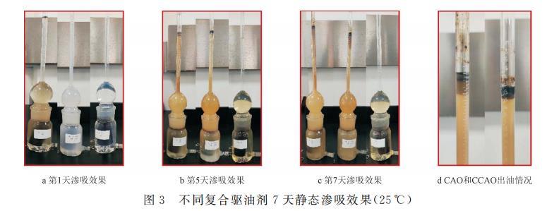 將巖心在110℃下烘干,稱重;將飽和好油的巖心置于阿莫特密封瓶(Amott cell瓶)中,分別加入試樣溶液(CAO、CCAO或FHQ-I的標(biāo)準(zhǔn)溶液)至略超過Amott cell瓶的最低刻度處,在25℃環(huán)境中,觀察并記錄其出油體積,通過計(jì)算得到的結(jié)果見表5,同時觀察不同時間飽和巖心滲吸出的原油形態(tài)(如圖3所示)。